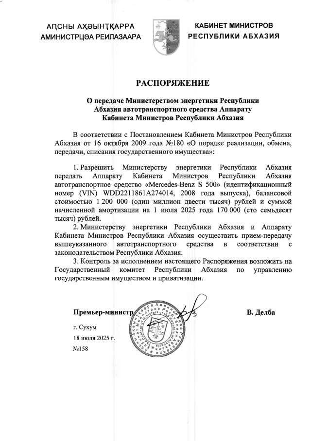 РАСПОРЯЖЕНИЕ Кабинета Министров Республики Абхазия от 18.07.2025 №158 "О передаче Министерством энергетики Республики Абхазия автотранспортного средства Аппарату Кабинета Министров Республики Абхазия"