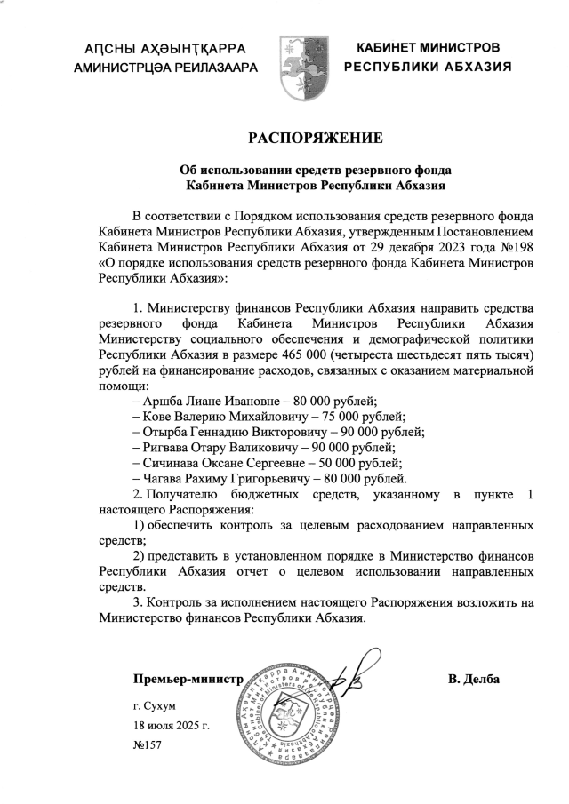 РАСПОРЯЖЕНИЕ Кабинета Министров Республики Абхазия от 18.07.2025 №157 "Об использовании средств резервного фонда Кабинета Министров Республики Абхазия"