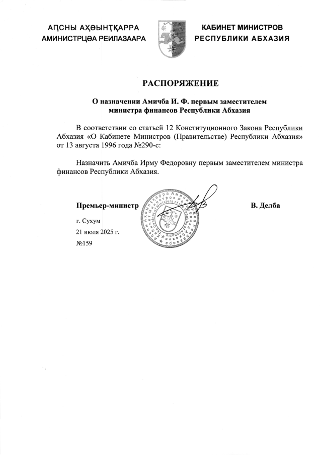 РАСПОРЯЖЕНИЕ Кабинета Министров Республики Абхазия от 21.07.2025 №159 "О назначении Амичба И. Ф. первым заместителем министра финансов Республики Абхазия"