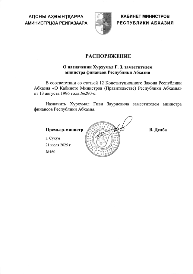 РАСПОРЯЖЕНИЕ Кабинета Министров Республики Абхазия от 21.07.2025 №160 "О назначении Хурхумал Г. З. заместителем министра финансов Республики Абхазия"