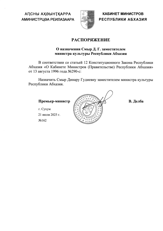 РАСПОРЯЖЕНИЕ Кабинета Министров Республики Абхазия от 21.07.2025 №162 "О назначении Смыр Д. Г. заместителем министра культуры Республики Абхазия"