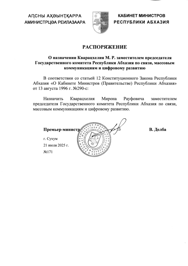 РАСПОРЯЖЕНИЕ Кабинета Министров Республики Абхазия от 21.07.2025 №171 "О назначении Кварацхелия М. Р. заместителем председателя Государственного комитета Республики Абхазия по связи, массовым коммуникациям и цифровому развитию"