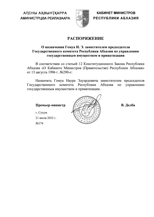РАСПОРЯЖЕНИЕ Кабинета Министров Республики Абхазия от 21.07.2025 №174 "О назначении Гемуа Н. Э. заместителем председателя Государственного комитета Республики Абхазия по управлению государственным имуществом и приватизации"