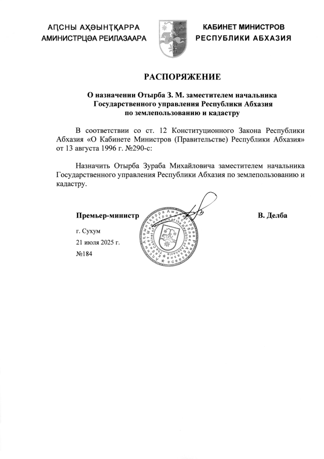 РАСПОРЯЖЕНИЕ Кабинета Министров Республики Абхазия от 21.07.2025 №184 "О назначении Отырба З. М. заместителем начальника Государственного управления Республики Абхазия по землепользованию и кадастру"