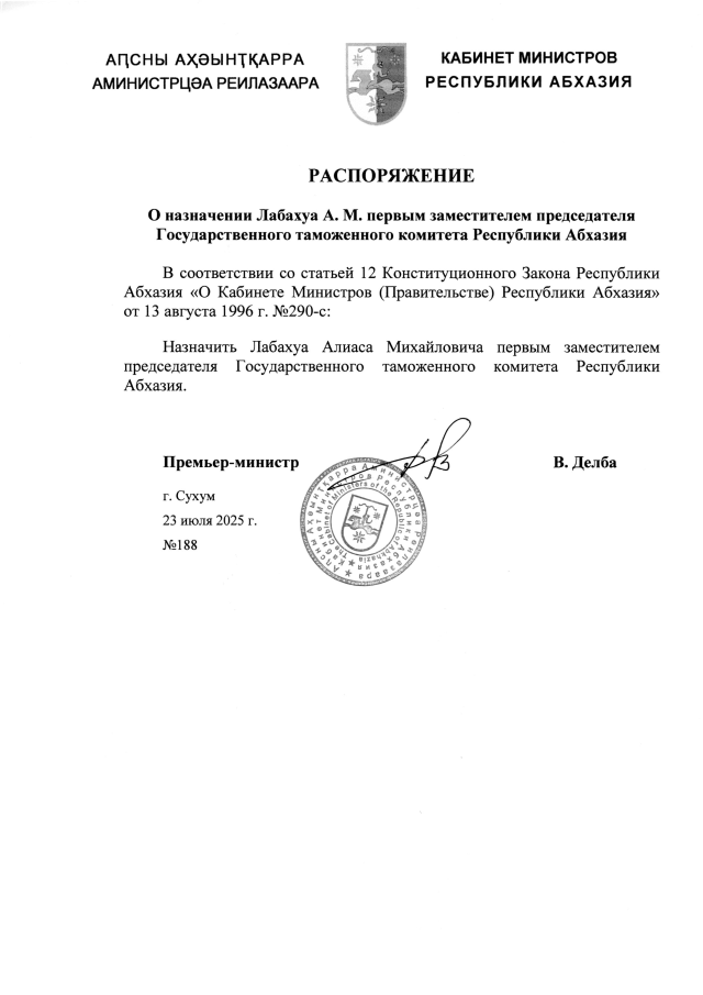 РАСПОРЯЖЕНИЕ Кабинета Министров Республики Абхазия от 23.07.2025 №188 "О назначении Лабахуа А. М. первым заместителем председателя Государственного таможенного комитета Республики Абхазия"
