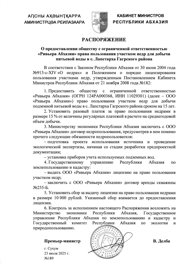 РАСПОРЯЖЕНИЕ Кабинета Министров Республики Абхазия от 23.07.2025 №189 "О предоставлении обществу с ограниченной ответственностью <Ривьера Абхазия> права пользования участком недр для добычи питьевой воды в с. Лапстарха Гагрского района"