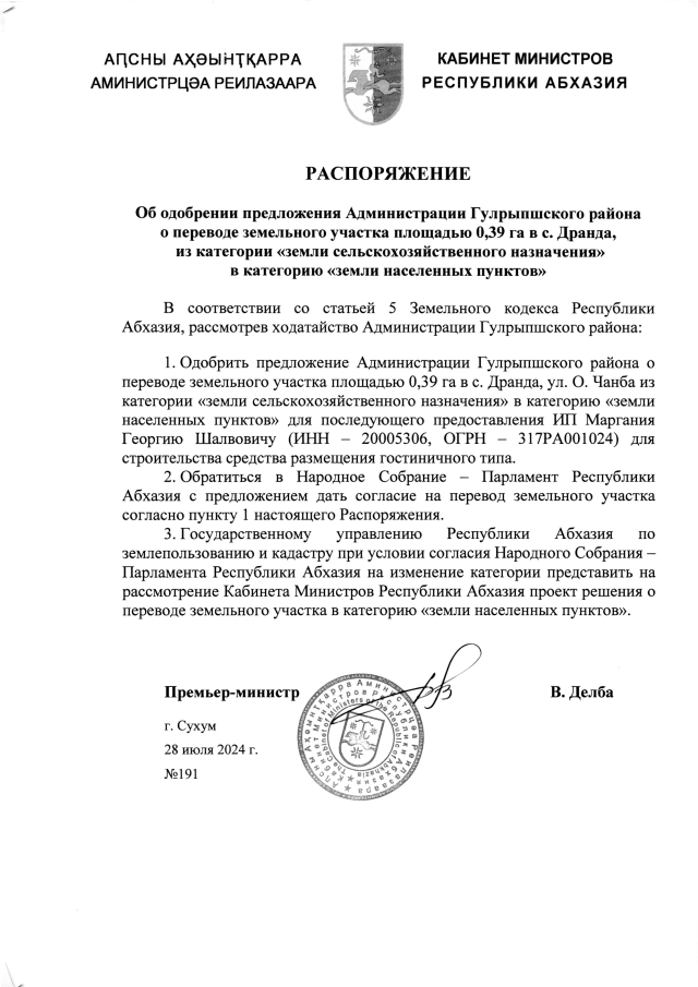 РАСПОРЯЖЕНИЕ Кабинета Министров Республики Абхазия от 28.07.2025 №191 "Об одобрении предложения Администрации Гулрыпшского района о переводе земельного участка площадью 0,39 га в с. Дранда, из категории <земли сельскохозяйственного назначения> в категорию <земли населенных пунктов>"