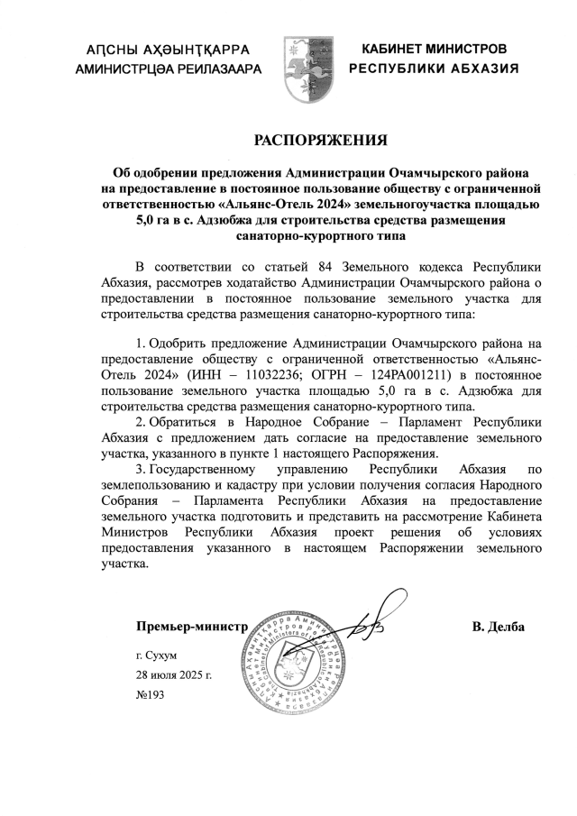РАСПОРЯЖЕНИЕ Кабинета Министров Республики Абхазия от 28.07.2025 №193 "Об одобрении предложения Администрации Очамчырского района на предоставление в постоянное пользование обществу с ограниченной ответственностью <Альянс-Отель 2024> земельногоучастка площадью 5,0 га в с. Адзюбжа для строительства средства размещения санаторно-курортного типа"