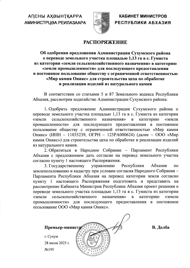 РАСПОРЯЖЕНИЕ Кабинета Министров Республики Абхазия от 28.07.2025 №195 "Об одобрении предложения Администрации Сухумского района о переводе земельного участка площадью 1,13 га в с. Гумиста из категории <земли сельскохозяйственного назначения> в категорию <земли промышленности> для последующего предоставления в постоянное пользование обществу с ограниченной ответственностью <Мир камня Оникс> для строительства цеха по обработке и реализации изделий из натурального камня"