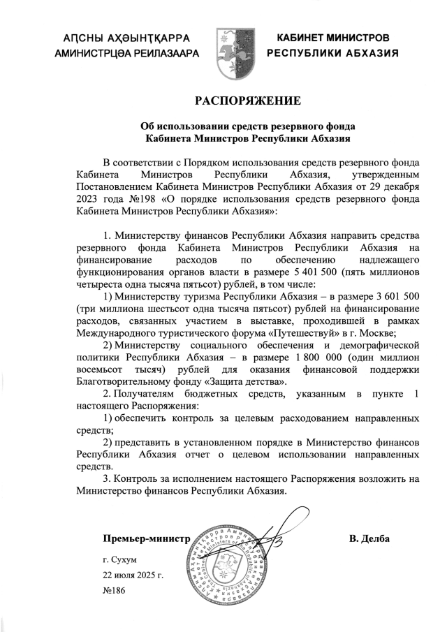 РАСПОРЯЖЕНИЕ Кабинета Министров Республики Абхазия от 28.07.2025 №196 "Об одобрении предложения Администрации Гагрского района о переводе земельного участка площадью 4,0 га в с. Лапстарха из категории <земли сельскохозяйственного назначения> в категорию <земли курортно-оздоровительного назначения>для последующего предоставления в постоянное пользование обществу с ограниченной ответственностью <Хаус Центр>для строительства средства размещения санаторно-курортного типа"
