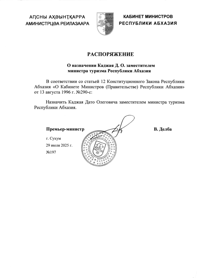 РАСПОРЯЖЕНИЕ Кабинета Министров Республики Абхазия от 29.07.2025 №197 "О назначении Каджая Д. О. заместителем министра туризма Республики Абхазия"