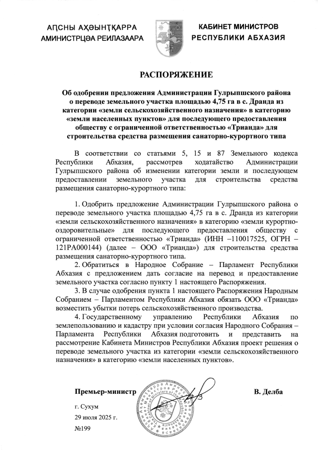 РАСПОРЯЖЕНИЕ Кабинета Министров Республики Абхазия от 29.07.2025 №199 "Об одобрении предложения Администрации Гулрыпшского района о переводе земельного участка площадью 4,75 га в с. Дранда из категории <земли сельскохозяйственного назначения> в категорию <земли населенных пунктов> для последующего предоставления обществу с ограниченной ответственностью <Трианда> для строительства средства размещения санаторно-курортного типа"