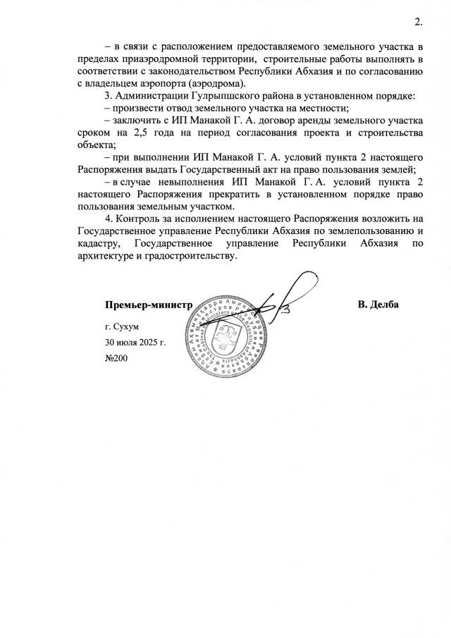 РАСПОРЯЖЕНИЕ Кабинета Министров Республики Абхазия от 30.07.2025 №200 "О даче согласия Администрации Гулрыпшского района на предоставление в постоянное пользование индивидуальному предпринимателю Манаке Г. А. земельного участка площадью 0,06 га для строительства средства размещения гостиничного типа"
