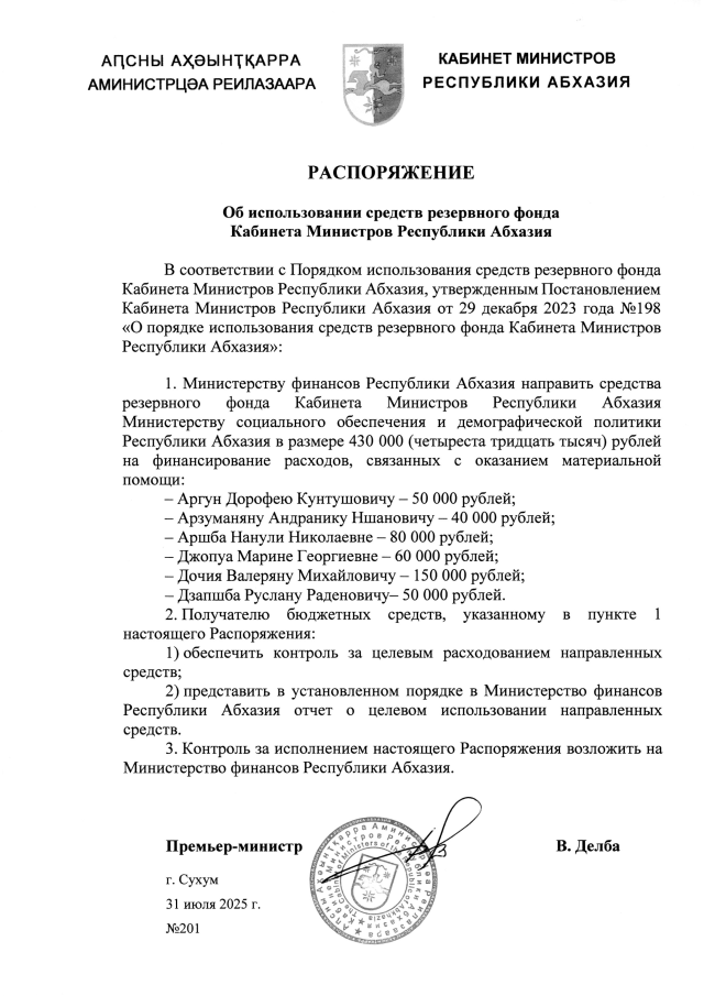 РАСПОРЯЖЕНИЕ Кабинета Министров Республики Абхазия от 31.07.2025 №201 "Об использовании средств резервного фонда Кабинета Министров Республики Абхазия"