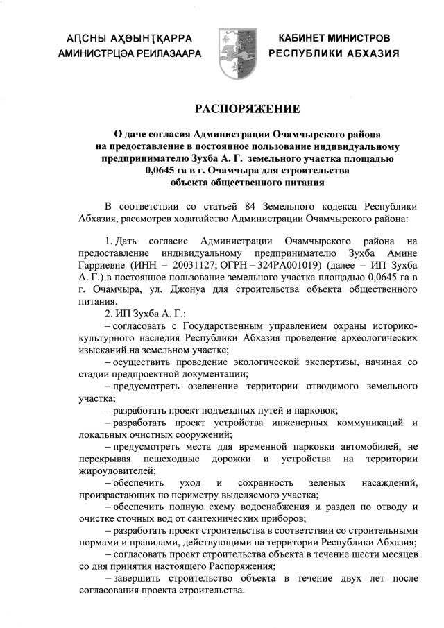 РАСПОРЯЖЕНИЕ Кабинета Министров Республики Абхазия от 01.08.2025 №208 "О даче согласия Администрации Очамчырского района на предоставление в постоянное пользование индивидуальному предпринимателю Зухба А. Г. земельного участка площадью 0,08 га в г. Очамчыра для строительства объекта общественного питания"