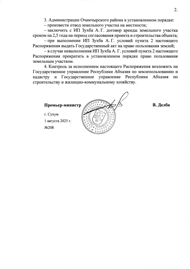 РАСПОРЯЖЕНИЕ Кабинета Министров Республики Абхазия от 01.08.2025 №208 "О даче согласия Администрации Очамчырского района на предоставление в постоянное пользование индивидуальному предпринимателю Зухба А. Г. земельного участка площадью 0,08 га в г. Очамчыра для строительства объекта общественного питания"