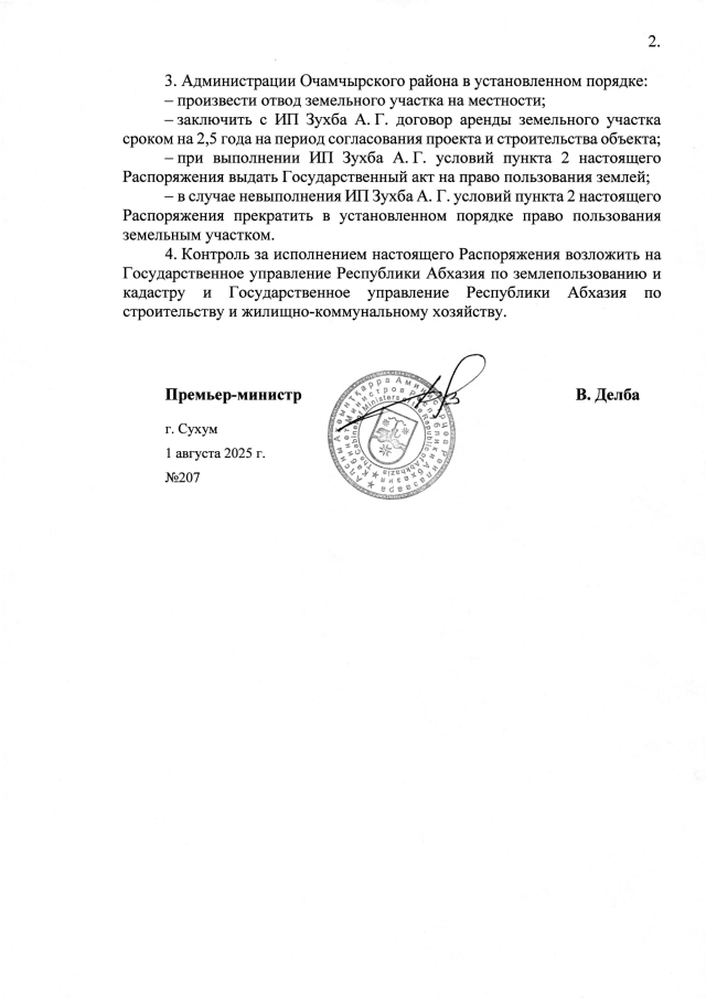 РАСПОРЯЖЕНИЕ Кабинета Министров Республики Абхазия от 01.08.2025 №207 "О даче согласия Администрации Очамчырского района на предоставление в постоянное пользование индивидуальному предпринимателю Зухба А. Г. земельного участка площадью 0,08 га в г. Очамчыра для строительства объекта общественного питания"