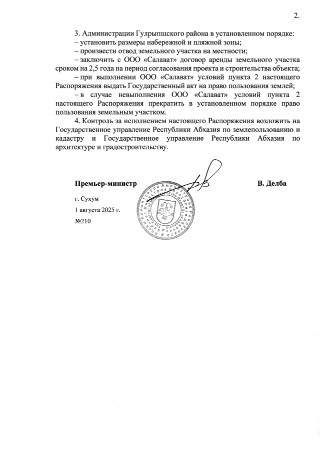 РАСПОРЯЖЕНИЕ Кабинета Министров Республики Абхазия от 01.08.2025 №210 "О даче согласия Администрации Гулрыпшского района на предоставление в постоянное пользование обществу с ограниченной ответственностью <Салават> земельного участка площадью 0,99 га в с. Бабышира для строительства средства размещения гостиничного типа"