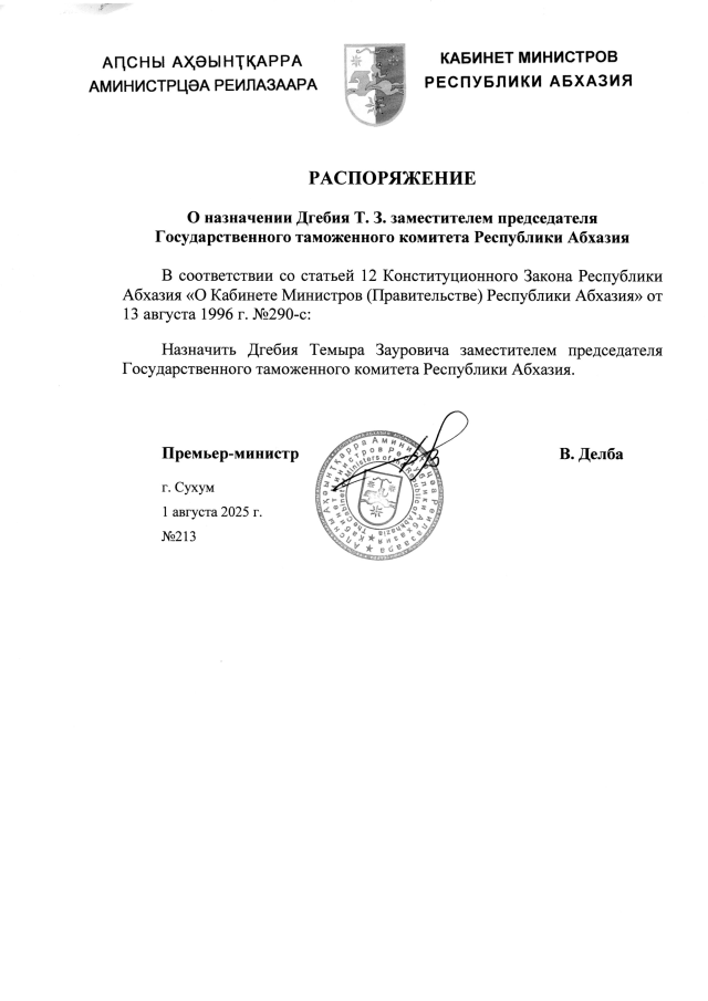 РАСПОРЯЖЕНИЕ Кабинета Министров Республики Абхазия от 01.08.2025 №213 "О назначении Дгебия Т. З. заместителем председателя Государственного таможенного комитета Республики Абхазия"
