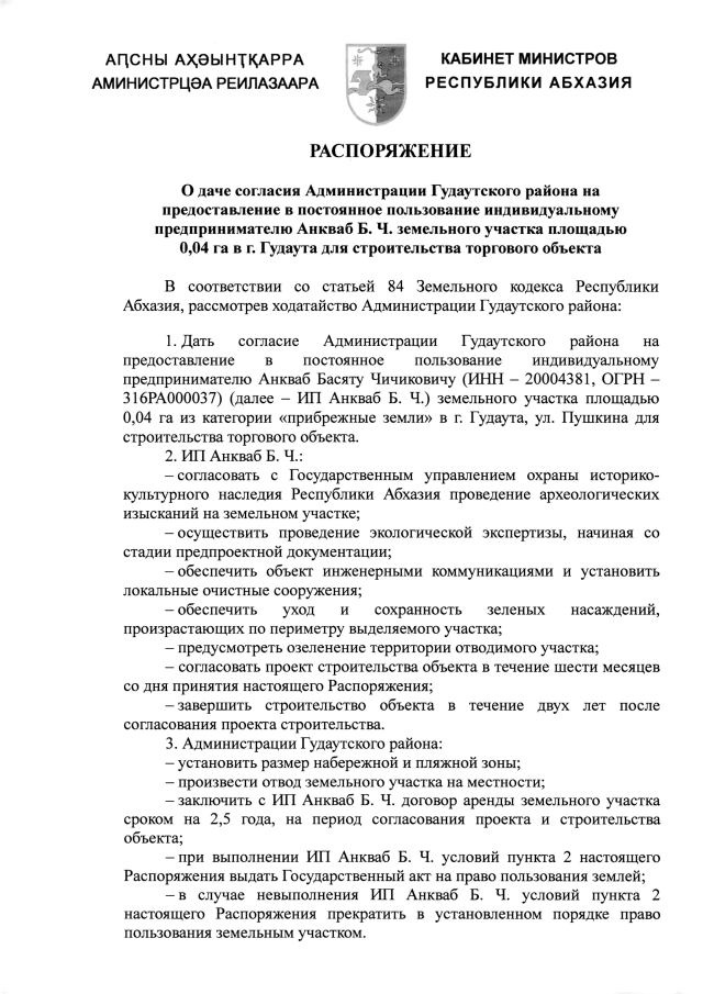 РАСПОРЯЖЕНИЕ Кабинета Министров Республики Абхазия от 01.08.2025 №217 "О даче согласия Администрации Гудаутского района на предоставление в постоянное пользование индивидуальному предпринимателю Анкваб Б. Ч. земельного участка площадью 0,04 га в г. Гудаута для строительства торгового объекта"