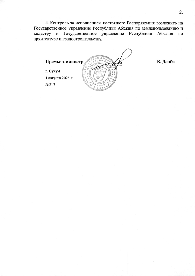 РАСПОРЯЖЕНИЕ Кабинета Министров Республики Абхазия от 01.08.2025 №217 "О даче согласия Администрации Гудаутского района на предоставление в постоянное пользование индивидуальному предпринимателю Анкваб Б. Ч. земельного участка площадью 0,04 га в г. Гудаута для строительства торгового объекта"