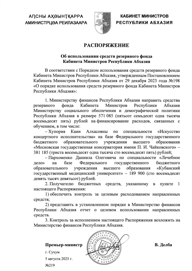 РАСПОРЯЖЕНИЕ Кабинета Министров Республики Абхазия от 05.08.2025 №219 "Об использовании средств резервного фонда Кабинета Министров Республики Абхазия"