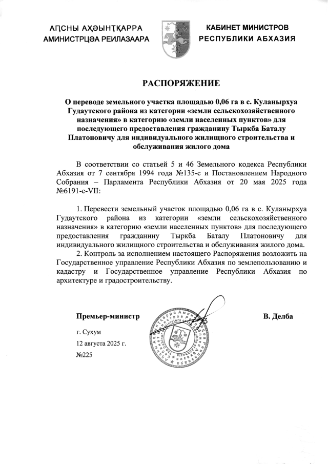 РАСПОРЯЖЕНИЕ Кабинета Министров Республики Абхазия от 12.08.2025 №225 "О переводе земельного участка площадью 0,06 га в с. Куланырхуа Гудаутского района из категории <земли сельскохозяйственного назначения> в категорию <земли населенных пунктов> для последующего предоставления гражданину Тыркба Баталу Платоновичу для индивидуального жилищного строительства и обслуживания жилого дома"