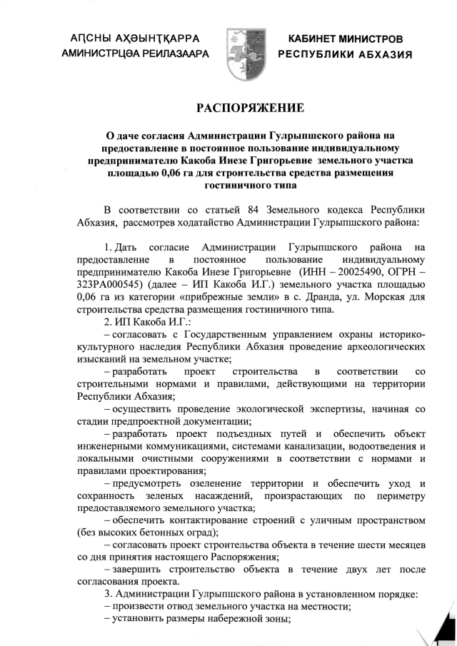 РАСПОРЯЖЕНИЕ Кабинета Министров Республики Абхазия от 12.08.2025 №228 "О даче согласия Администрации Гулрыпшского района на предоставление в постоянное пользование индивидуальному предпринимателю Какоба Инезе Григорьевне земельного участка площадью 0,06 га для строительства средства размещения гостиничного типа"