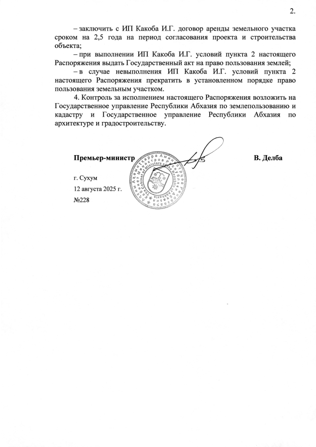 РАСПОРЯЖЕНИЕ Кабинета Министров Республики Абхазия от 12.08.2025 №228 "О даче согласия Администрации Гулрыпшского района на предоставление в постоянное пользование индивидуальному предпринимателю Какоба Инезе Григорьевне земельного участка площадью 0,06 га для строительства средства размещения гостиничного типа"