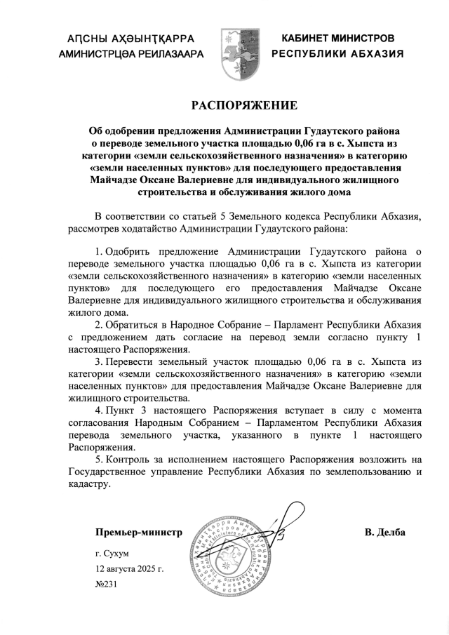 РАСПОРЯЖЕНИЕ Кабинета Министров Республики Абхазия от 12.08.2025 №231 "Об одобрении предложения Администрации Гудаутского района о переводе земельного участка площадью 0,06 га в с. Хыпста из категории <земли сельскохозяйственного назначения> в категорию <земли населенных пунктов> для последующего предоставления Майчадзе Оксане Валериевне для индивидуального жилищного строительства и обслуживания жилого дома"