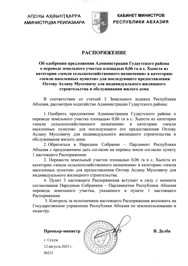 РАСПОРЯЖЕНИЕ Кабинета Министров Республики Абхазия от 12.08.2025 №233 "Об одобрении предложения Администрации Гудаутского района о переводе земельного участка площадью 0,06 га в с. Хыпста из категории <земли сельскохозяйственного назначения> в категорию <земли населенных пунктов> для последующего предоставления Охтову Аслану Муссовичу для индивидуального жилищного строительства и обслуживания жилого дома"
