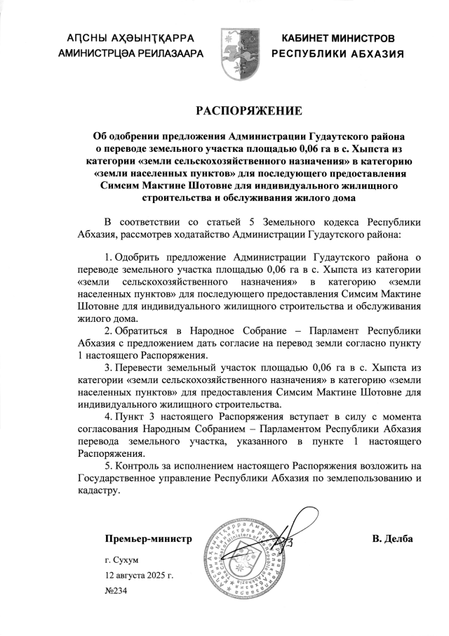 РАСПОРЯЖЕНИЕ Кабинета Министров Республики Абхазия от 12.08.2025 №234 "Об одобрении предложения Администрации Гудаутского района о переводе земельного участка площадью 0,06 га в с. Хыпста из категории <земли сельскохозяйственного назначения> в категорию <земли населенных пунктов> для последующего предоставления Симсим Мактине Шотовне для индивидуального жилищного строительства и обслуживания жилого дома"