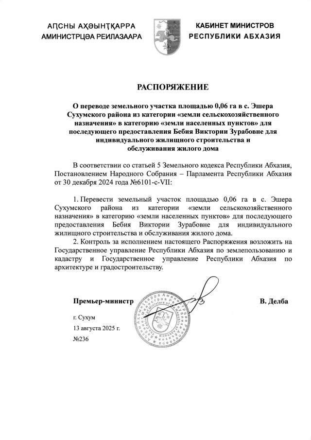 РАСПОРЯЖЕНИЕ Кабинета Министров Республики Абхазия от 13.08.2025 №236 "О переводе земельного участка площадью 0,06 га в с. Эшера Сухумского района из категории <земли сельскохозяйственного назначения> в категорию <земли населенных пунктов> для последующего предоставления Бебия Виктории Зурабовне для индивидуального жилищного строительства и обслуживания жилого дома"