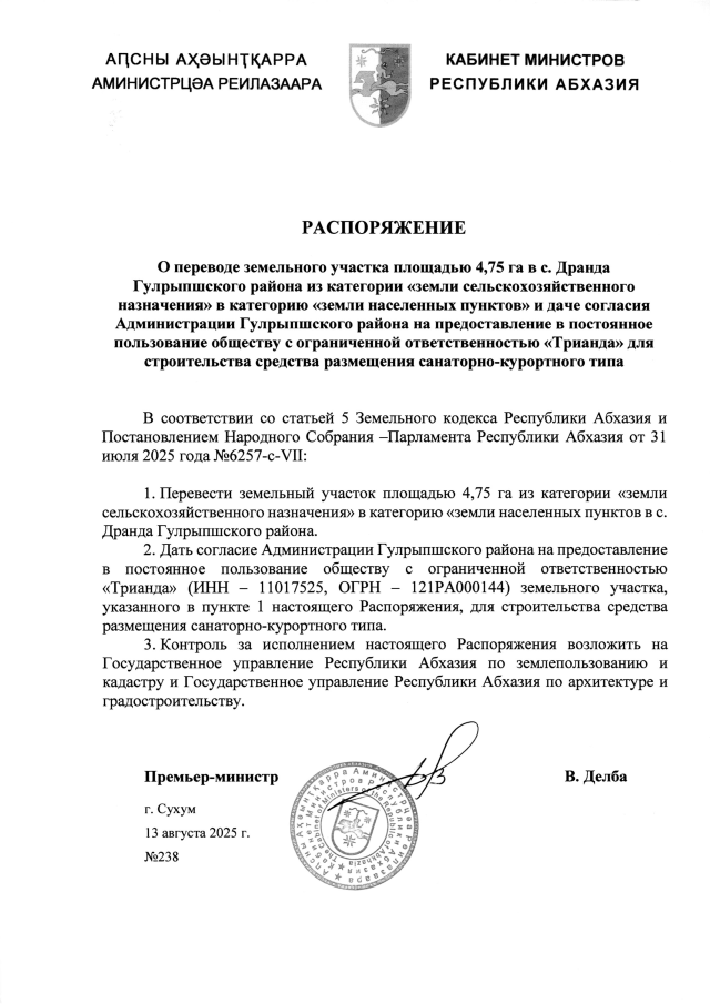 РАСПОРЯЖЕНИЕ Кабинета Министров Республики Абхазия от 13.08.2025 №238 "О переводе земельного участка площадью 4,75 га в с. Дранда Гулрыпшского района из категории <земли сельскохозяйственного назначения> в категорию <земли населенных пунктов> и даче согласия Администрации Гулрыпшского района на предоставление в постоянное пользование обществу с ограниченной ответственностью <Трианда> для строительства средства размещения санаторно-курортного типа"