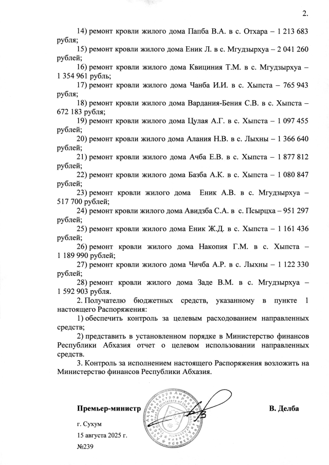 РАСПОРЯЖЕНИЕ Кабинета Министров Республики Абхазия от 15.08.2025 №239 "Об использовании средств резервного фонда Кабинета Министров Республики Абхазия"