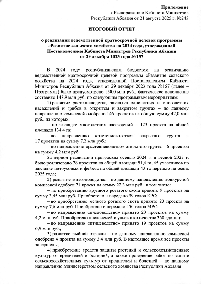 РАСПОРЯЖЕНИЕ Кабинета Министров Республики Абхазия от 21.08.2025 №245 "Об итоговом отчете о реализации ведомственной краткосрочной целевой программы <Развитие сельского хозяйства на 2024 год>, утвержденной Постановлением Кабинета Министров Республики Абхазия от 29 декабря 2023 года №157"