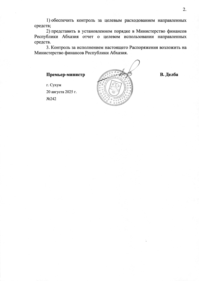 РАСПОРЯЖЕНИЕ Кабинета Министров Республики Абхазия от 20.08.2025 №242 "Об использовании средств резервного фонда Кабинета Министров Республики Абхазия"