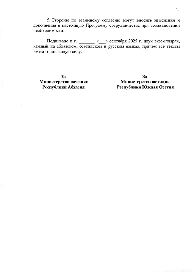 РАСПОРЯЖЕНИЕ Кабинета Министров Республики Абхазия от 21.08.2025 №244 "О проекте Программы сотрудничества между Министерством юстиции Республики Абхазия и Министерством юстиции Республики Южная Осетия на 2025 - 2026 годы"
