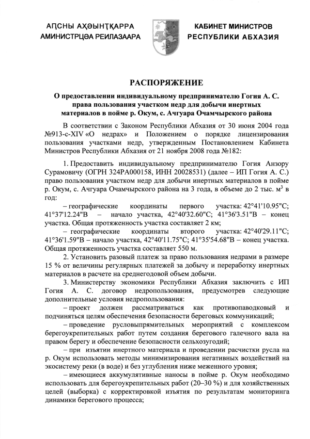 РАСПОРЯЖЕНИЕ Кабинета Министров Республики Абхазия от 21.08.2025 №246 "О предоставлении индивидуальному предпринимателю Гогия А. С. права пользования участком недр для добычи инертных материалов в пойме р. Окум, с. Ачгуара Очамчырского района"