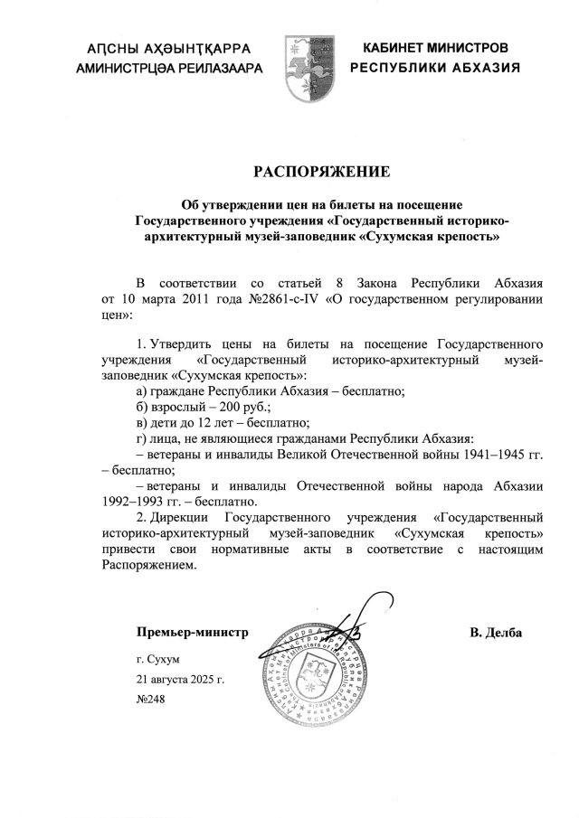 РАСПОРЯЖЕНИЕ Кабинета Министров Республики Абхазия от 21.08.2025 №248 "Об утверждении цен на билеты на посещение Государственного учреждения <Государственный историко-архитектурный музей-заповедник <Сухумская крепость>"