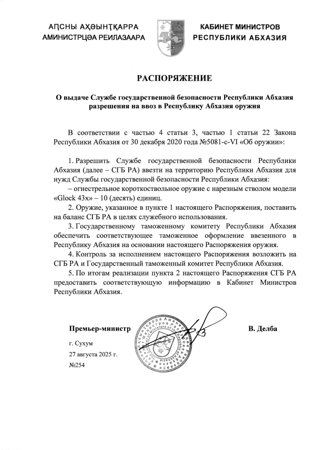 РАСПОРЯЖЕНИЕ Кабинета Министров Республики Абхазия от 27.08.2025 №254 "О выдаче Службе государственной безопасности Республики Абхазия разрешения на ввоз в Республику Абхазия оружия"