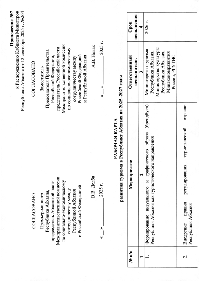 РАСПОРЯЖЕНИЕ Кабинета Министров Республики Абхазия от 12.09.2025 №265 "О согласовании проектов Рабочих карт в сфере образования, здравоохранения, социальной защиты населения, инвестиционной деятельности, коммунальной инфраструктуры, электроэнергетики, туризма и транспорта в Республике Абхазия на 2025-2027 годы"