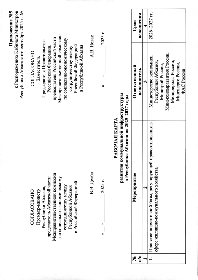 РАСПОРЯЖЕНИЕ Кабинета Министров Республики Абхазия от 12.09.2025 №265 "О согласовании проектов Рабочих карт в сфере образования, здравоохранения, социальной защиты населения, инвестиционной деятельности, коммунальной инфраструктуры, электроэнергетики, туризма и транспорта в Республике Абхазия на 2025-2027 годы"