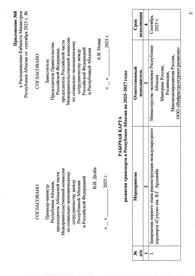 РАСПОРЯЖЕНИЕ Кабинета Министров Республики Абхазия от 12.09.2025 №265 "О согласовании проектов Рабочих карт в сфере образования, здравоохранения, социальной защиты населения, инвестиционной деятельности, коммунальной инфраструктуры, электроэнергетики, туризма и транспорта в Республике Абхазия на 2025-2027 годы"