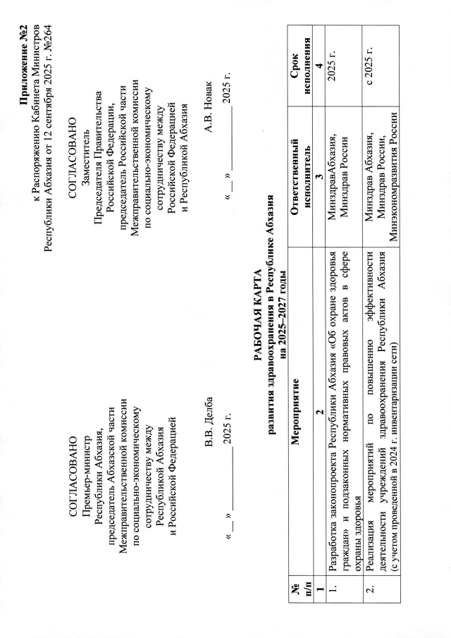 РАСПОРЯЖЕНИЕ Кабинета Министров Республики Абхазия от 12.09.2025 №265 "О согласовании проектов Рабочих карт в сфере образования, здравоохранения, социальной защиты населения, инвестиционной деятельности, коммунальной инфраструктуры, электроэнергетики, туризма и транспорта в Республике Абхазия на 2025-2027 годы"