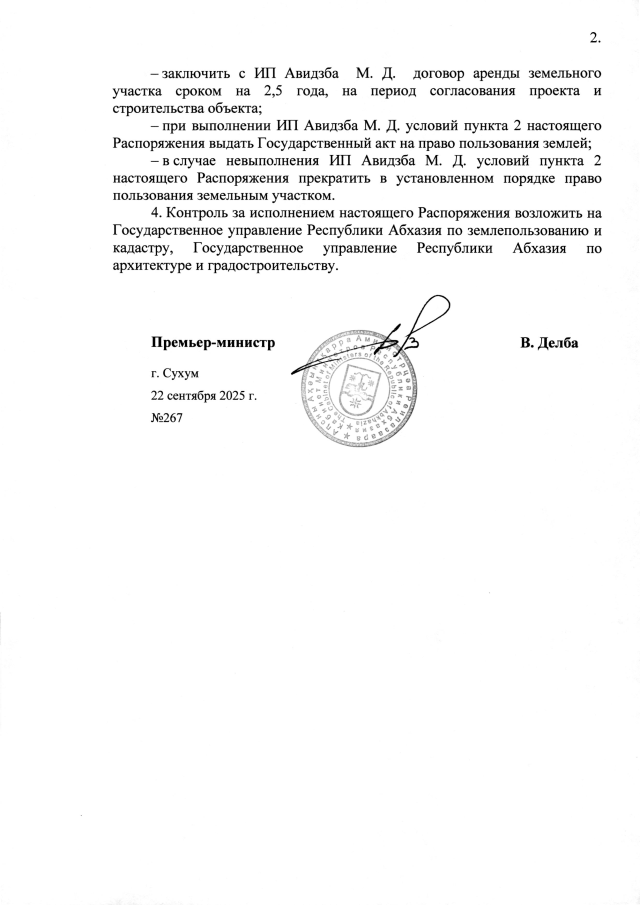 РАСПОРЯЖЕНИЕ Кабинета Министров Республики Абхазия от 22.09.2025 №267 "О даче согласия Администрации Гагрского района на предоставление в постоянное пользование индивидуальному предпринимателю Авидзба М. Д. земельного участка площадью 0,18 га в г. Гагра для строительства средства размещения гостиничного типа"