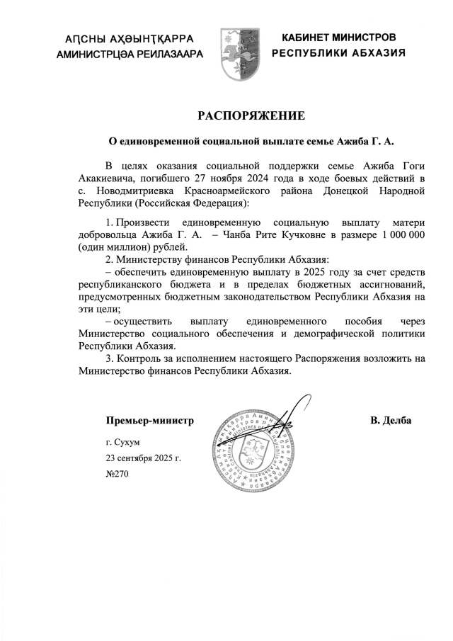РАСПОРЯЖЕНИЕ Кабинета Министров Республики Абхазия от 23.09.2025 №270 "О единовременной социальной выплате семье Ажиба Г. А."
