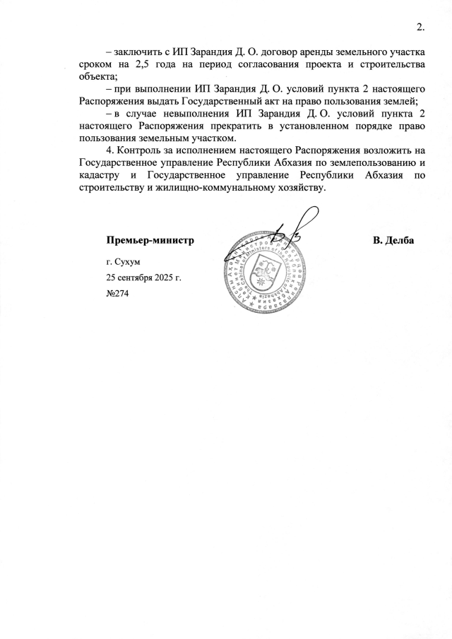 РАСПОРЯЖЕНИЕ Кабинета Министров Республики Абхазия от 25.09.2025 №274 "О даче согласия Администрации Гулрыпшского района на предоставление в постоянное пользование индивидуальному предпринимателю Зарандия Д. О. земельного участка площадью 0,06 га в с. Дранда для строительства средства размещения гостиничного типа"