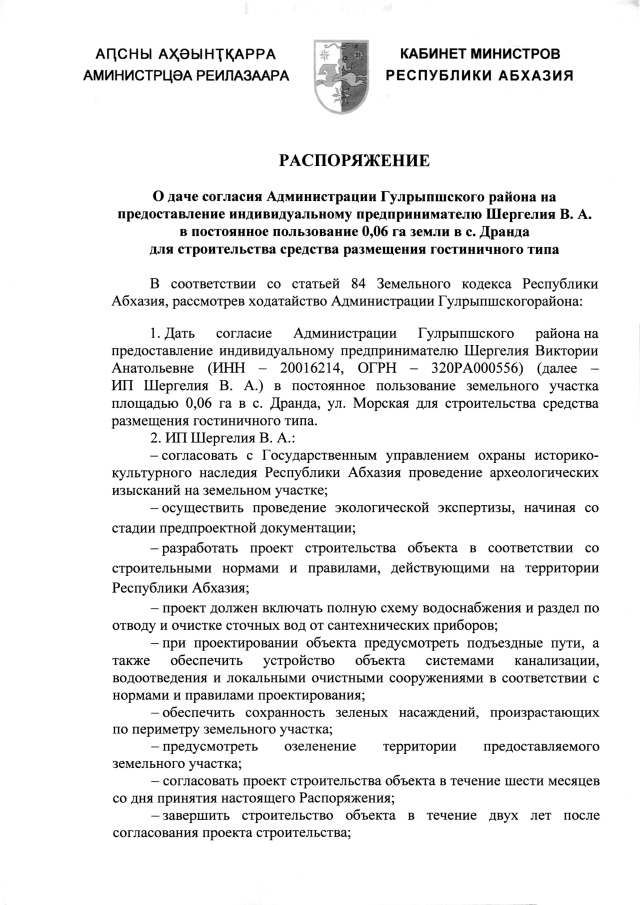 РАСПОРЯЖЕНИЕ Кабинета Министров Республики Абхазия от 25.09.2025 №276 "О даче согласия Администрации Гулрыпшского района на предоставление индивидуальному предпринимателю Шергелия В. А. в постоянное пользование 0,06 га земли в с. Дранда для строительства средства размещения гостиничного типа"