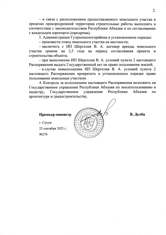 РАСПОРЯЖЕНИЕ Кабинета Министров Республики Абхазия от 25.09.2025 №276 "О даче согласия Администрации Гулрыпшского района на предоставление индивидуальному предпринимателю Шергелия В. А. в постоянное пользование 0,06 га земли в с. Дранда для строительства средства размещения гостиничного типа"